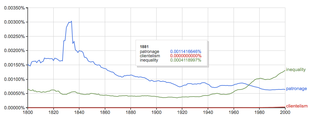 So, as I am a little preoccupied with finding better language to talk about informal politics, i thought i turn to the Ngram viewer to see how the usage of two very similar words, ‘patronage’ and ‘clientelism’, changes over time. I put ‘inequality’ in there for a comparative measure. The results are quite striking. Up until the 1970’s, the readers of Google’s books were more likely to find something about patronage then about inequality. Apparently the 1830’s were the heyday of writing about patronage. This was back when the resistance against patronage-appointments (‘jobs for the boys’, i.e. giving government jobs to your supporters) in the civil service in the US and the UK (and the rest of Western Europe) was gathering some steam. This eventually led to bureaucratic reform measures adopted in the late 19th century.